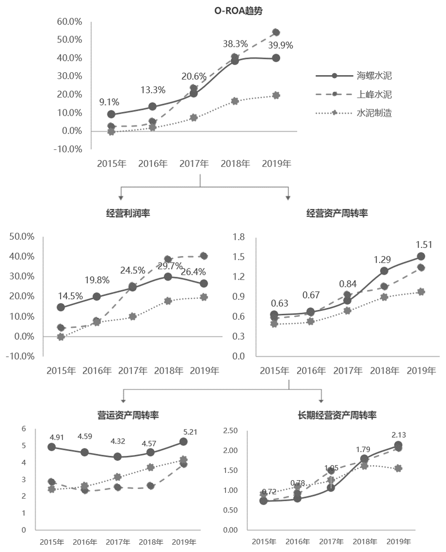 2015—2019年,海螺水泥经营资产收益率(O-ROA)逐年提升,与前四年平均值相比,2019年公司O-ROA上升20个百分点,只不过与上峰水泥相比,上峰水泥的经营资产收益率也在逐年增长且增长速度更快,而带动上峰水泥O-ROA增长的主要动力是其经营利润率的快速增长。