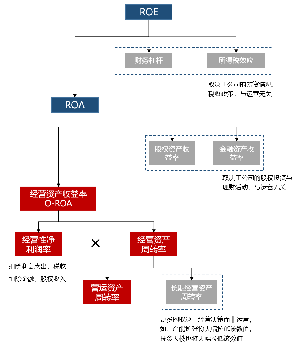 此外,在之前的利润质量和资产质量分析中提到,上市公司的利润不一定全部来自自身经营活动,企业的非主业收益也是利润构成中的重要部分。同时,企业的资产也是可分为经营性资产和投资性资产,非金融企业中经营性资产应该占比最大。因而当我们去分析一家上市公司的盈利能力时,我们关注的应该是其主业的盈利能力及经营性资产的回报率,于是我们将净资产收益率(ROE)重新进行拆解,具体如下: