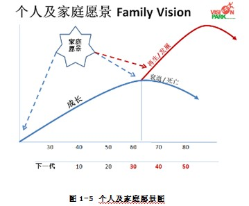 除了需要考虑“人”的生命周期外,身为企业主,也需要考虑自己的人生愿景与企业“经营周期”的关系,更需要明白你无法摆脱“事业只局限于自己这一代”的宿命论。因为不管你愿不愿意,一般人都会在65岁左右退休,在这个年龄的生理状况都会大不如前,更重要的是如果没有提早规划自己的退休生活,为培育接班人而做传承的准备,以让企业真正达到“永续经营”的目的(见图1-5)。那么,如果企业主在身体健康逐年下降的情况下,还得继续经营自己的事业,他不但无法享受早年奋斗的成果,更严重的是会使自己的健康状况急速下滑,甚至危及生命。如果死亡又是在没有“接班人”的情况下到来,那么留给家人的将不是“现金”,而是一大堆的问题,甚至是“债务”!相信这不是企业主当初创办企业时所愿意看到的情景。