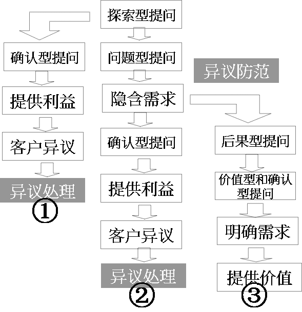 所谓异议防范就是用策略性提问的方法,以问题型提问发现客户的难题和不满;以后果型提问把问题放大再放大,使客户看到问题造成后果的严重性,增加你的产品或方案的价值;以价值型提问使客户自己解释得到的利益和好处,消除客户的对抗心理。当产品或方案的价值大于客户的付出成本的时候,客户产生价格异议的可能性就大大降低了。同样,针对能力异议,当销售人员采用策略性提问的时候,由于对客户所面临的共性问题有一个总体把握,同时销售人员作为顾问能帮助客户进行个性化的需求诊断,并且针对诊断结果提出解决方案以解决客户的问题,当客户依靠你的专业度而产生信任度,其对有关能力异议也相应地减少了(见异议防范和异议处理图③)。
