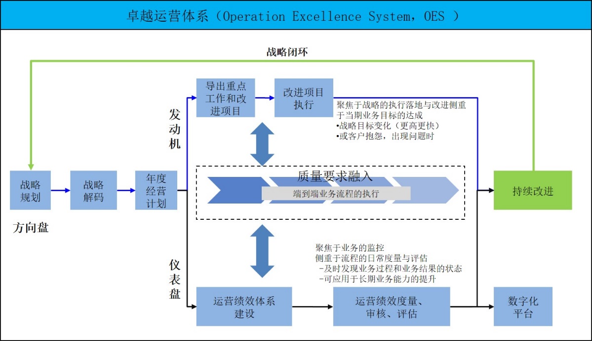 卓越运营体系(OES)从战略规划(SP,定方向)开始,经过战略解码,最后形成年度经营计划(BP),包括重点工作及考核指标等。而日常的运营则通过流程管理来承载,将质量要求融入流程中。同时,通过数字化平台及时监控各个流程的执行情况(流程绩效指标),及时识别到运营瓶颈问题,推动业务流程改进,实现管理螺旋式上升。