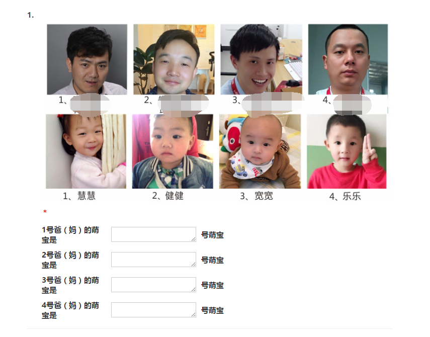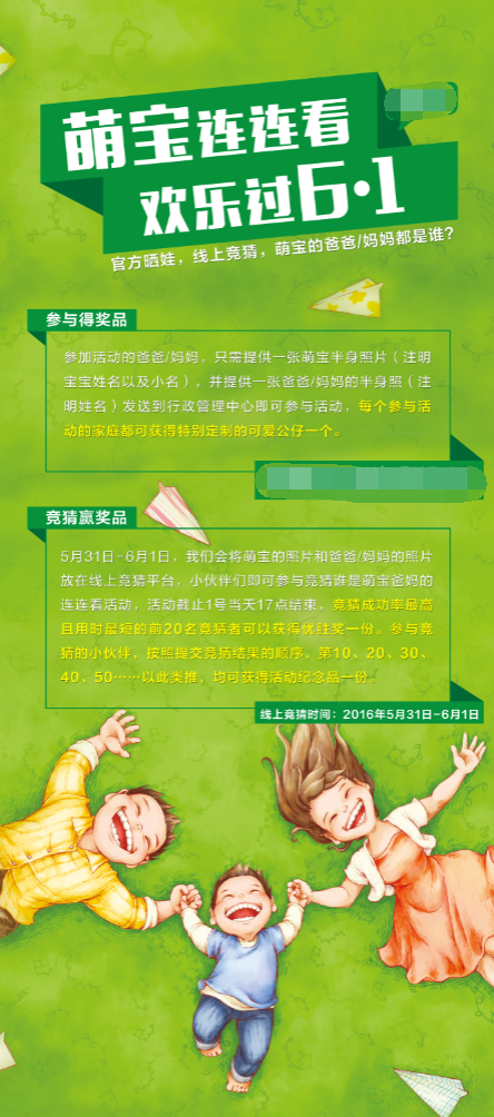 2016年5月31日—6月1日,我们会将萌宝的照片和爸爸/妈妈的照片放在线上竞猜平台,大家可参与竞猜谁是萌宝爸妈的连连看活动,活动截止1号当天17点,竞猜成功率最高且用时最短的前20名竞猜者可以获得优胜奖一份。参与竞猜的员工,按照提交竞猜结果的顺序,第10、20、30、40、50……以此类推,均可获得活动纪念品一份。