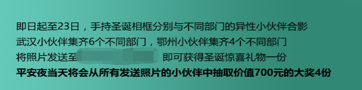 有一个看似玩笑但颇有几分道理的观点是:看一个公司好不好首先看公司里的美女、帅哥多不多。既然美女、帅哥是一个公司好坏的重要标准,那么异性同事之间的良性互动一定能让公司充满活力,为了这个目的,同时活跃圣诞节的气氛,我策划了“圣诞拉近你我”的线下活动,在圣诞节当天也为全体员工发放了平安果及小礼物。