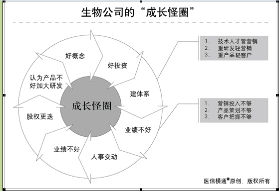 近几年接触了很多生物技术企业,有生产药品的、疫苗的、器械的、治疗技术的,等等。我们发现,有些生物公司陷进了一个成长的怪圈,如图1-2所示。