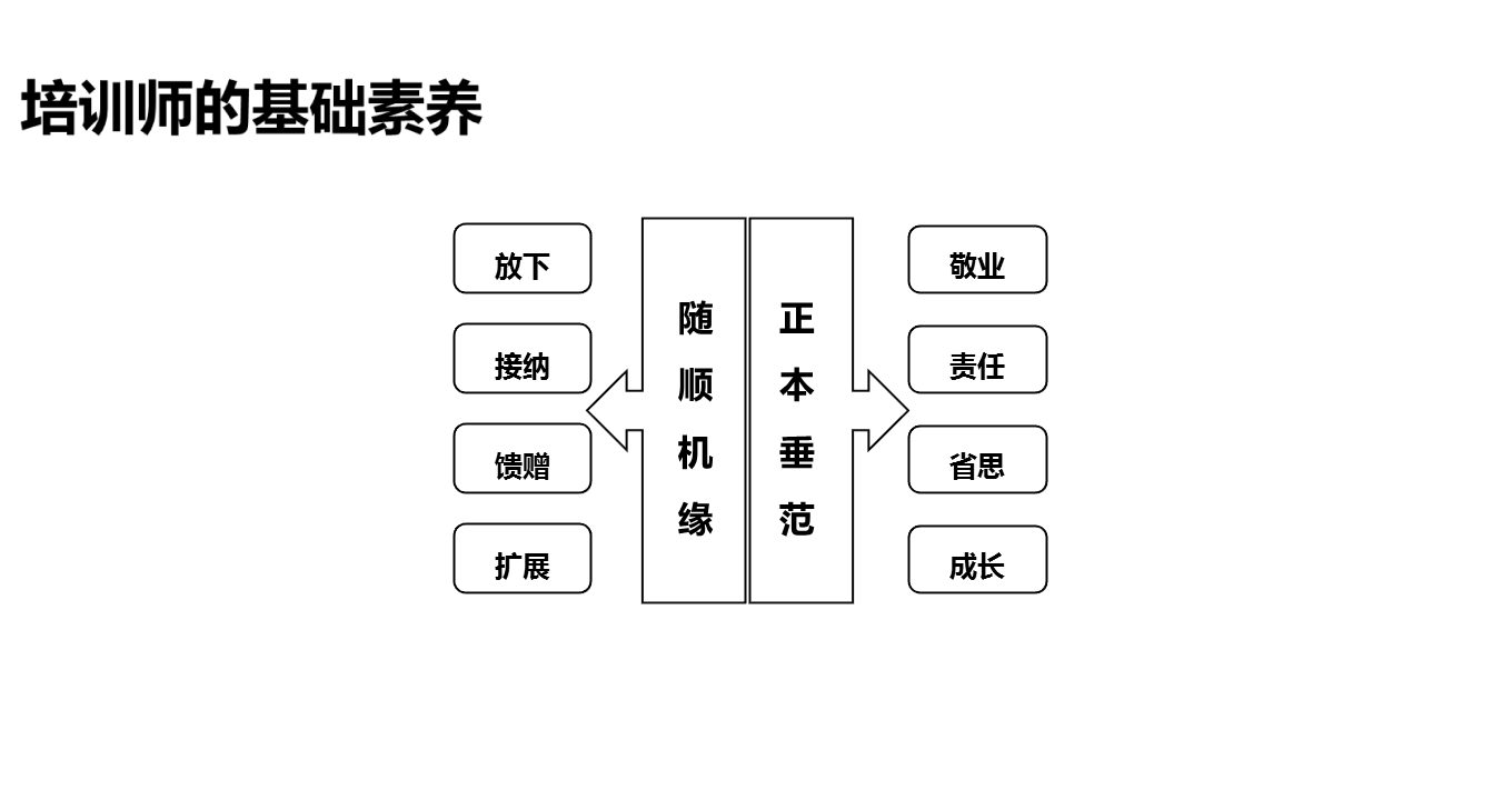 很显然,仅“放下”“接纳”“馈赠”“扩展”及“敬业”“责任”“省思”“成长”这几个词,并不足于穷尽(或涵盖)培训师所应该具备的职业素养,而且,素养本身也没有确切的标准尺度。所以,持续改进,并且建立更多更好的职业习惯,必定是培训师的日常功课之一。