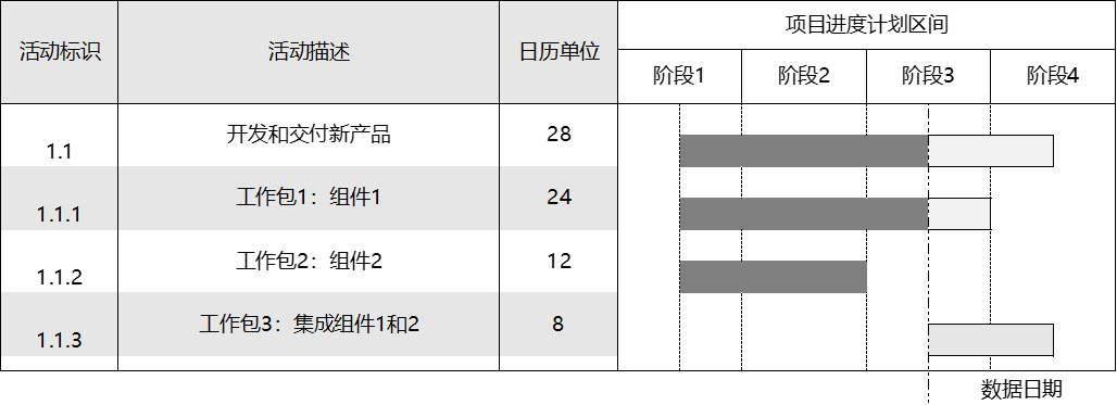 又称为“横道图”,展示进度信息的一种图表方式。纵向列出活动,横向标明日期,用横条表示活动自开始日期至结束日期的持续时间,通常用于和管理层进行沟通。如图8-22所示。