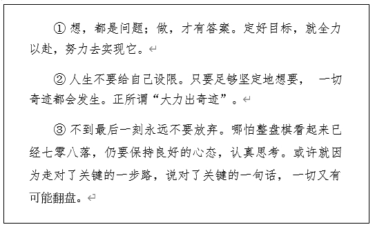 第二,不到最后一刻永远不要放弃,哪怕整盘棋看起来已经七 零八落,仍要保持良好的心态,认真思考,或许就因为走对了关键 一步路,说对了关键一句话,一切又有可能翻盘。