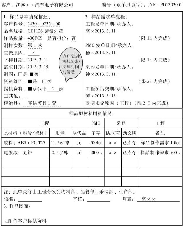 根据过程设想、质量目标、设计目标,制定初始的工艺流程图设想,这个设想一旦成型,工程部门就要准备制样的工装与设备。对初始流程图不做特别要求。参见表1-2-3。