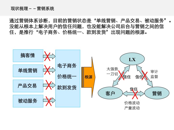 “价格公开、统一定价、款到发货”的营销政策,靠营销人员与用户的采购人员之间单线营销,根本实施不了。营销政策的差异,在产品同质化之下是否有效,完全取决于营销战略与营销模式的差异。LX需要系统梳理营销战略,尤其是进行营销模式的创新。