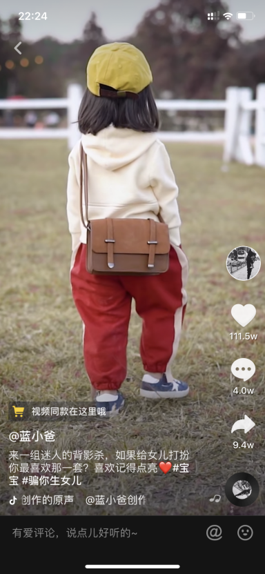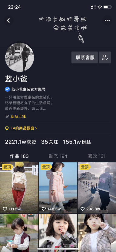 举几个服装行业的案例。第一个案例是,抖音账号“蓝小爸”(图7-1)是杭州一个做童装的团队做的。之前是拍老板的女儿,因为经常去韩国、日本拍照,加上老板女儿身体不太好,又不太配合,所以他们找了一个模特,组建了一个相对比较专业的团队来拍这些产品。9月关注的时候他们才有35万粉丝,现在已经有155万多了。现在他们每个月引流的淘宝销量数据在20万件以上。