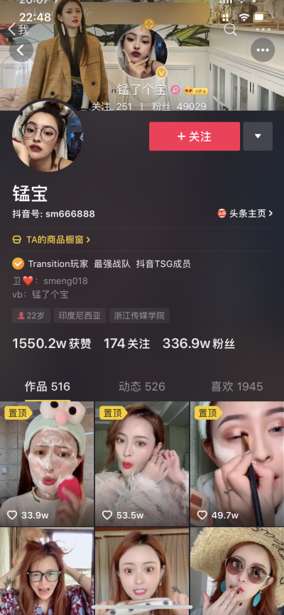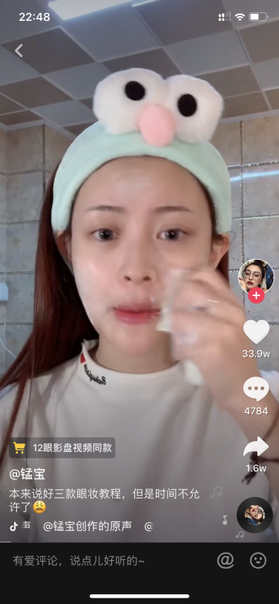 有一个抖音账号“锰宝”,之前是微商团队,在抖音火起来之后,开始切入做抖音,结果有337万粉丝。老板是一位女士,就在抖音上面教别人怎样化妆(图7-3)。内容比较趣味性,比较生活化,比较有针对性。微商最难解决的就是流量问题,用抖音这样的方式,就把流量问题解决了,而且客户十分精准。然后,她又把这种方式分享给她的代理,生意自然发展很快。