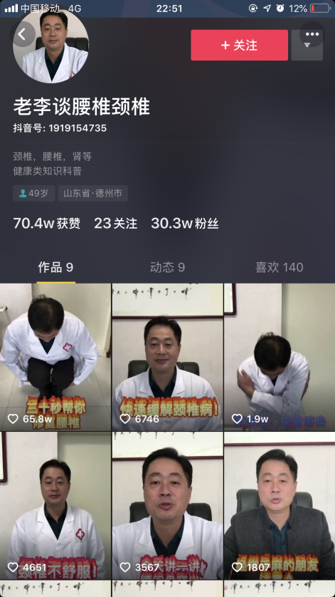 很多保健品、医疗号,经常通过这种方式吸引精准人群。什么头疼病、颈椎病、更年期之类的,有的组建抖音矩阵,每个账号一种疾病,针对一类人群,只要内容足够专业,就能大量吸引精准粉丝。随后在微信及社群里,转化为一个实物产品,或者一套易操作教程课件进行营销变现。