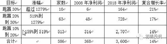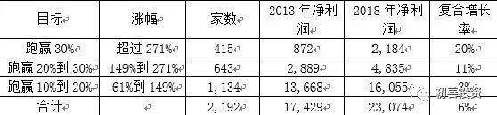 笔者带大家看看企业的净利润情况,从三类企业净利复合增长率来看,涨幅越高,净利润增长率越高,涨幅超过11146%的公司净利润复合增长率为28%,涨幅在2562%~11146%的净利润复合增长率为25%,涨幅在456%~2562%的净利润复合增长率为21%。如表3-5所示。