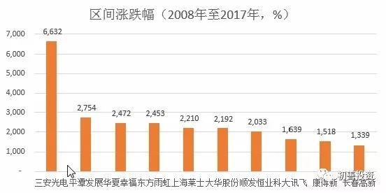 (2)时间拉长到十年的情况。从2008年年初到2017年年底,十年时间,涨幅跑赢年化10%的个股共计513只,跑赢年化20%的个股共计63只,跑赢年化30%的个股共计10只,对应涨幅分别对应159%、519%和1279%。513只企业主要分布在医药、电子、计算机、化工、传媒、家电等领域。如图3-3所示。