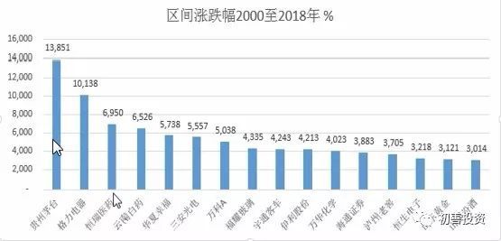 (3)如果把时间拉长到2018年,即从2000年1月1日至2018年1月1日,数据会如何呢?涨幅跑赢年化10%的个股的共计276只,涨幅跑赢年化20%的个股共计20只,而能跑赢30%的个股只有1只:贵州茅台,涨幅分别对应456%、2562%和11146%。也就是说,持有一个股票不换,从2000年到现在,涨幅能满足复利30%的只有贵州茅台。从行业上看,主要分布在医药生物、房地产、化工、汽车食品饮料等,家电股只有4家入选。如图3-5所示。