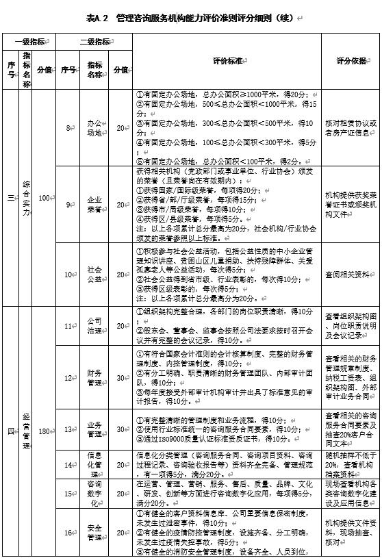 为了评价管理咨询师是否达到所申请等级的咨询理论和实践水平,具备相应等级的职业咨询能力,评价机构应依本细则表A.2和表A.3所载的8项内容(涵盖了管理咨询师基本职业素养、管理咨询师通识、咨询师专业能力;学历与职称、获奖情况、咨询成果、咨询案例、咨询能力)进行评价,然后采用机考或现场答辩评审两种方式对评价对象进行能力评价。
