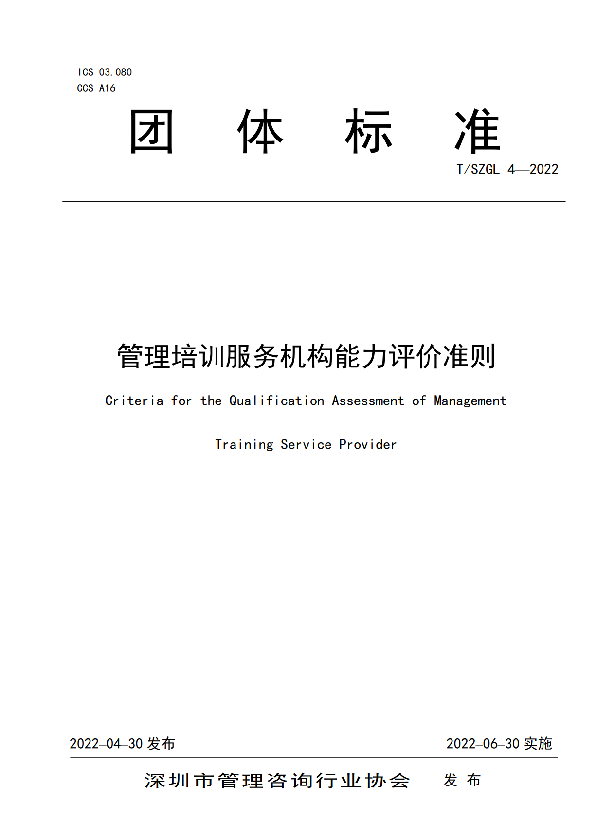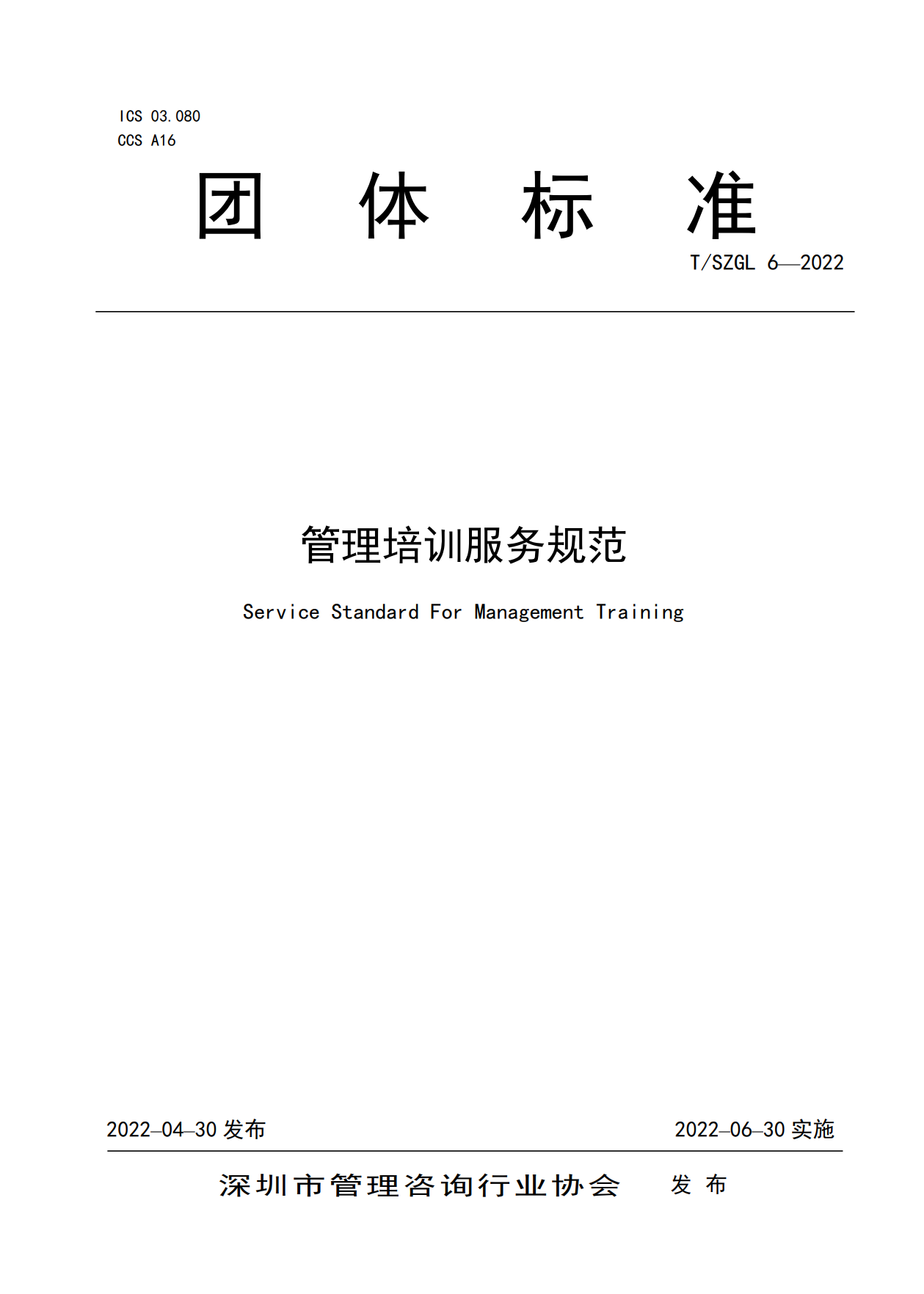 2022年,深圳市管理咨询行业协会在全国同行业中首次推出《管理咨询师能力评价准则》(T/SZGL 1-2022)、《管理培训师能力评价准则》(T/SZGL 2-2022)、《管理咨询服务机构能力评价准则》(T/SZGL 3-2022)、《管理培训服务机构能力评价准则》(T/SZGL 4-2022)、《管理咨询服务规范》(T/SZGL 5-2022)、《管理培训服务规范》(T/SZGL 6-2022)六项行业团体系列标准,并于同年7月9日向社会各界及媒体公开发布(详见:深圳市标准信息平台官网http://szbz.sist.org.cn 全国团体标准信息平台http://www.ttbz.org.cn)。