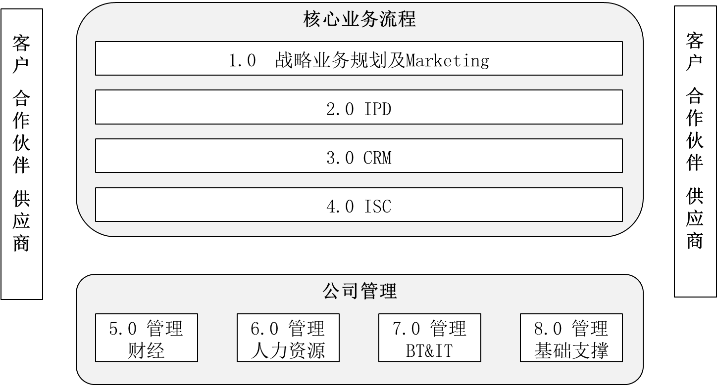 该流程架构将公司核心业务流程分成四个业务流程:战略规划及Marketing,客户关系管理(CRM),集成产品研发(IPD),集成供应链(ISC))。将公司管理分成四个管理支持流程:管理财经、管理人力资源、管理变革与IT、管理基础支撑。