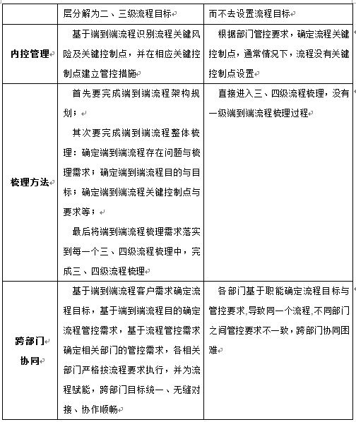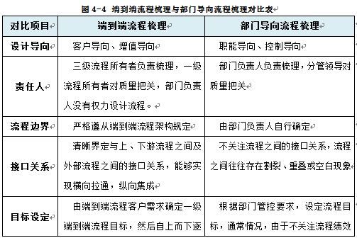 与端到端流程梳理模式相对应的是部门导向的流程梳理,这两种模式之间的区别如表