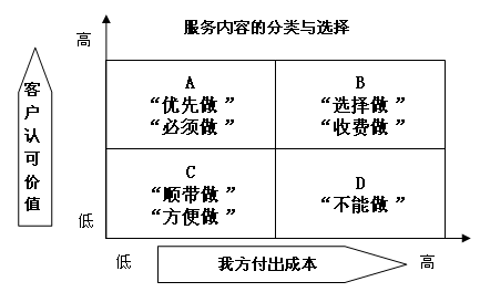 B类为客户认可价值高,而企业付出成本大的服务内容,策略是“选择做”、“收费做”。例如,周期性的保养与检修设备,客户虽然需要,但我们也要根据情况,区分轻重缓急,要么适当收费,要么根据具体情况有所不为。