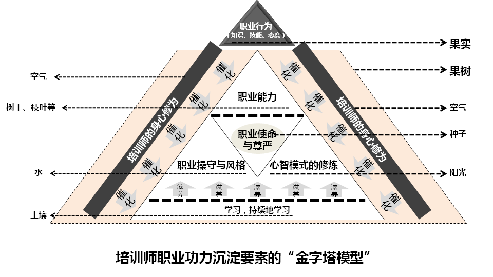 从这一模型可以看出,培训师的职业行为(果实)如何,由职业功力作为一个整体(果树)来决定,而职业功力(果树)的整体状态又是由职业能力和素养(树干和枝叶等)直接表现出来。继续梳理下去,就可以知道,以下要素都对职业功力产生着不同的作用与影响,包括: