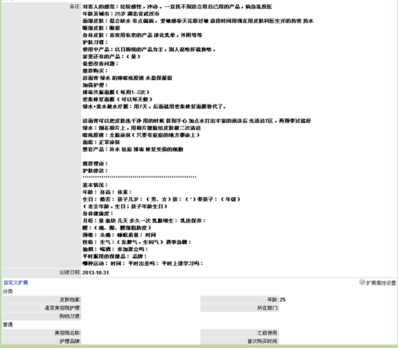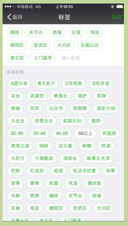 微信标签:客户类别(ABCD类)+分店店铺+使用的品牌+地区+社会关系+护理项目等30项。