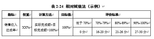 相对赋值法是一种对工作成果或工作履行情况在一定区间内进行等级划分,并对各等级用数据或事实进行具体和清晰的界定,据此对被考核者的实际工作完成情况进行评价的方法。相对赋值法的优点是能够清楚、直观地用数据或事实描述出各个级别的不同,且每一等级严格对应固定的分数,奖励和处罚的力度比较大,易于拉开考评分数差距;其缺点是分级描述比较复杂,指标标准设计的工作量较大。