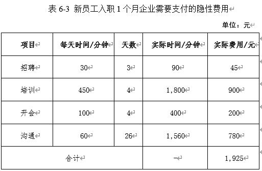 从财务思维角度考虑,每位新员工的入职都会带来一系列的隐性成本,包括培训、招聘、开会和沟通等费用。以规划薪酬每分钟0.5元为例,通过表6-3的测算,我们可以看到在新员工入职的第一个月内,企业至少需要支付1,925元的隐性费用。这些费用是人事部门和销售部门为了培养员工而投入的时间成本。如果考虑到更长的周期,如6个月或1年,这些费用将会进一步累积。