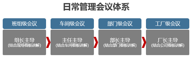 在日常管理过程中,固化一个日常管理会议,通过会议机制不断的回顾问题和解决问题。一般情况下,日常管理会议会有四个层级会议,主要有班组级会议、车间级会议、部门级会议、工厂级会议。