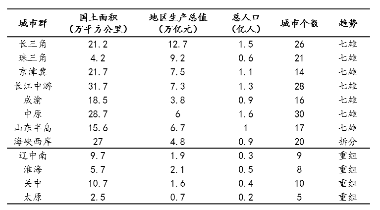 本书在开篇描述过十二个“诸侯国”的缘起和现状,又对城市群进行了逐一分析,在“经济战国”时代,我们对十二个主要城市群进行筛分,很容易辨识出谁才是真正的“新战国七雄”。