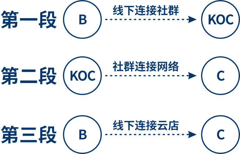 我们认为,与其说是线下→社群→网络的立体连接,不如用三大连接主体表述更清晰,即B端→KOC→C端的连接。