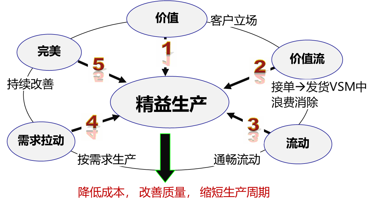 5 | 完美 | 不断消除各层次的浪费,持续改进,追求尽善尽美,比如库存大幅降低、生产周期缩短、质量提高、各种资源(能源、空间、材料、人力)等的使用效率提高,各种浪费减少、生产成本下降,企业利润增加。同时,员工士气、企业文化、领导力、生产技术都在实施中得到提升,最终增强了企业的竞争力 |