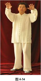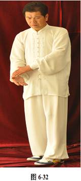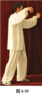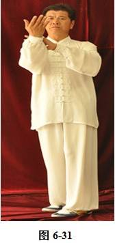 接上式,挤出后,腰微含,右腰向左上方提转,眼神及右脚皆随之转动,右脚向左内转,脚尖转向西南,身体转向正南,顺势右手上翻,手心朝上成穿掌式,左手不动,腰往后微拱,成下採之式,将左右两手拉回右腹前,腰向右外旋转,身体转向西南,左手随转离开右手腕,落至右侧胯上端,面部侧向西北,右手翻转,掌心向下斜指向西北于右胯侧外,重心移落右腿。用左腰提起左脚,脚尖朝向正南,与左肩平行向前迈小半步的距离(见图6-31至6-42)。腰向上提走弧形,两臂随腰向左上划弧,身体随提腰转向正南,两臂抬至略高于肩,重心移向左腿;腰向左撑,随之后拱,带动两臂向左外下划圆收回腹前,重心移向右腿。收回时,左掌翻转掌心向上,右掌心向下两掌微微相合,腰微含,向右侧缓慢旋转打出右肘,腰回转面向正南,眼神转向右平视,腰微拱,随之上提,带右臂往右前方送,右手五指撮拢,指尖朝下变勾手状。臂抬略高于肩,左手仍置腹前,左腰向左外旋转,提左膝身体随之旋转,左脚向左侧迈出一步,右脚尖随身转体内转,朝向东南,身体面向正东。左腰轻轻向上提,借势左手向前打开成掤式,重心前移成左弓步;腰微拱,后腿膝微屈,重心移向右腿,左手随之翻转掌心向下按,眼神向前平视。