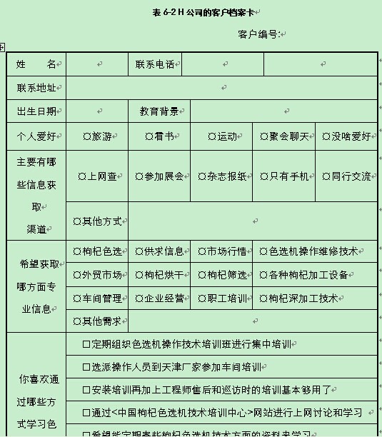 建立客户资料档案是工业品企业客户关系维护的基础,通过分级管理,能够有计划地对客户进行回访和服务,能够深入挖掘客户需求,发现新的销售线索,提升销售业绩。可通过客户档案卡进行管理,如下例所示。