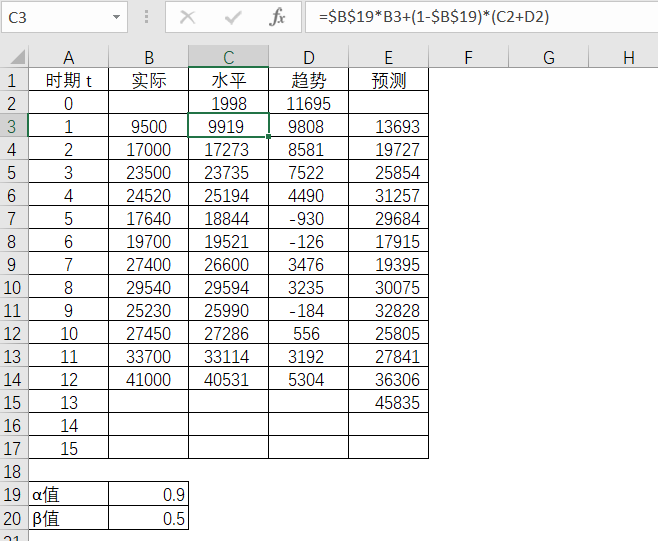 这样就得出了第1期的水平值为9919,趋势值为9808,预测值为13693,并如此类推,可以得到后续各期的水平值,趋势值和预测值。