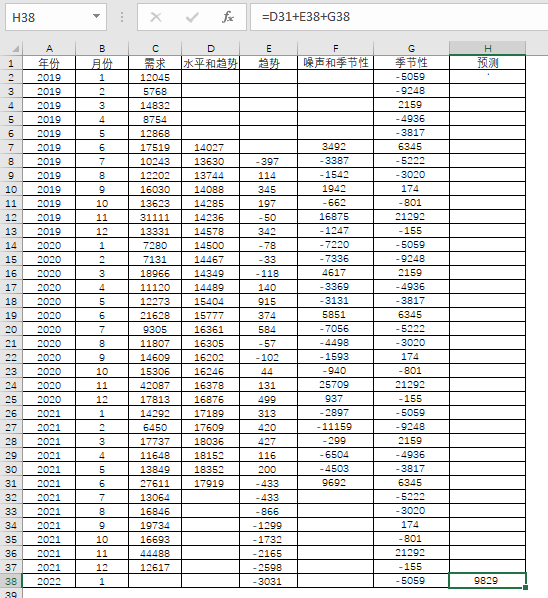 得出的2022年1月预测值为9829,包含了水平,趋势和季节性因素,当然,这不会包含随机因素,即噪声。