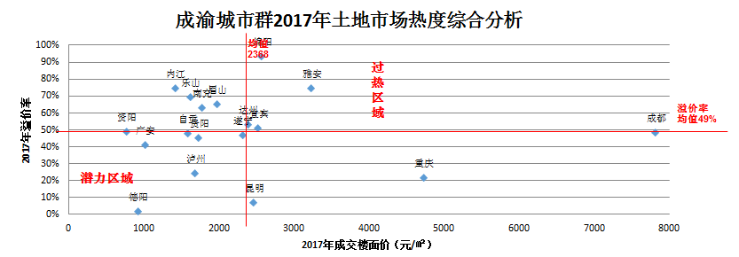 土地市场热度从成交楼面地价和溢价率两个维度考虑,成交楼面地价和溢价率均较低代表土地市场潜在热度较大。重点关注城市有泸州、遂宁、贵阳、自贡、广安及资阳。(溢价率在5%以下市场公开程度较低,需谨慎关注。)