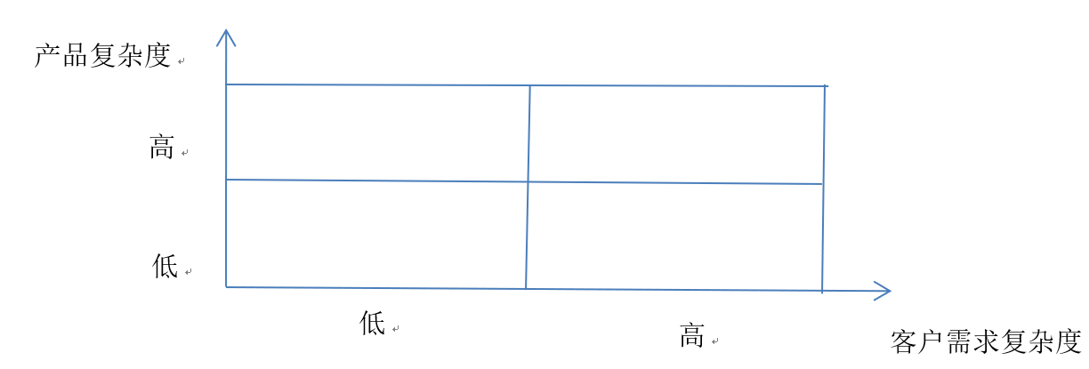 产品复杂度低、客户需求复杂度高 (产品单一或模块化产品+个性化客户需求) | 产品标准化,拥有多元化需求客户的中央空调、定制家居企业,银行按揭贷款业务,劲酒、“六个核桃”等快消品企业 |