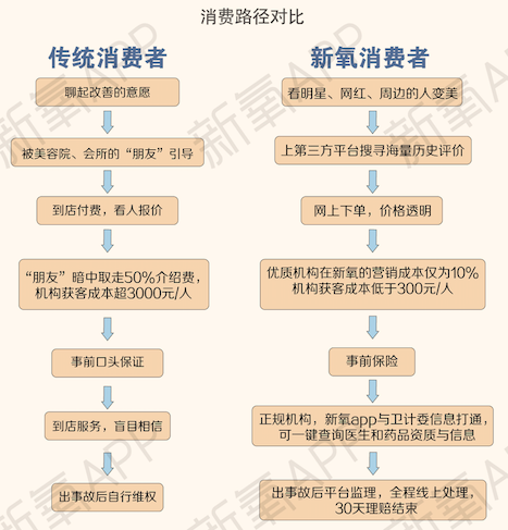 新氧给用户减去了中间销售环节付出的高昂成本,其核心是通过内容和口碑传播降低机构获客成本,从而拉低消费价格。