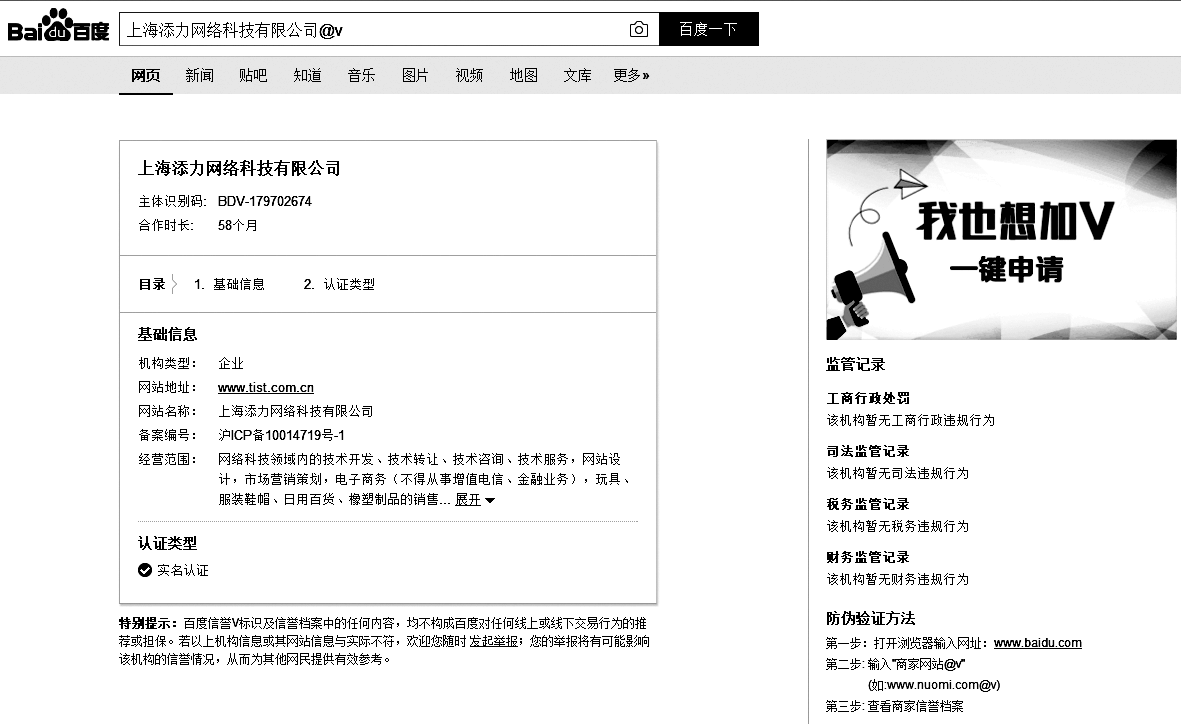 图3-3反映的信息量很大,可以让采购员初步判定这家企业的真实可靠性。可以看到,添力公司与百度合作了58个月,经营范围完全是从企业的营业执照上抄过来的,企业通过了百度的实名认证,而且没有任何来自工商、司法、税务、财务方面的违法记录。近几年,我们在许多客户的网站访问数据里看到不少访客去看企业的V认证信息,他们要么是老道的采购,在选择优质的供应商;要么是老道的销售员,在选择优质的客户;甚至是老道的求职者,在选择正规的企业。