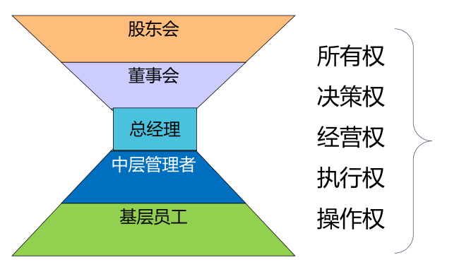 最上面的是股东会,拥有对这个公司的所有权,而总经理作为经营的执行者,有着承上启下的作用,每一个层面都代表不同的权利。而这个权利的背后其实是职责和权限的分工。这个分工意味着一个公司有了这样的机构,在相对应的事件上就应该由对应层面的人去负责和执行,这样才能分工明确,理清关系。所以公司治理结构的完善,是企业从老板个人管理、个人决策,到机构管理、组织决策的转变,同时也避免个人决策时,受到个人因素的影响,使得各利益相关者利益受损,从而影响公司的发展。