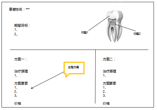 第三,要有方案的要素。包括治疗的流程、周期、材质、服务内容和团队。目的是前面提到的在做方案推荐的时候会有三个层次的价值塑造过程。一是人员和团队的价值;二是方案的价值;三是材质和设备的价值。这三个方面的要素都要在文字版方案里有明确的设定。这样,就能让患者深刻地认识前面说的三个层次的价值。