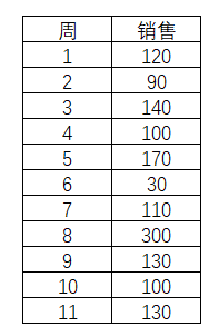 华尔公司的第1周到第11周的销售数据。计算出来的均值是129个单位。