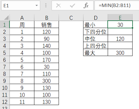 剔除异常值,找出四分位值,可以利用Excel函数计算。先通过函数MIN , MAX , MEDIAN分别计算出最小值,最大值和中位数值。