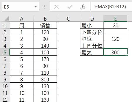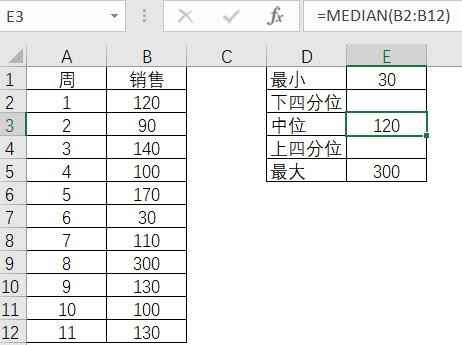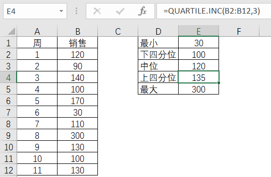 图3-14函数中的B2:B13后面数字的1和3表示第一个四分位点(即1/4)和第三个四分位点(3/4),四分位距则是 135- 100 = 35 ,从而可以知道50%的销售数字都在这35的距离里波动。