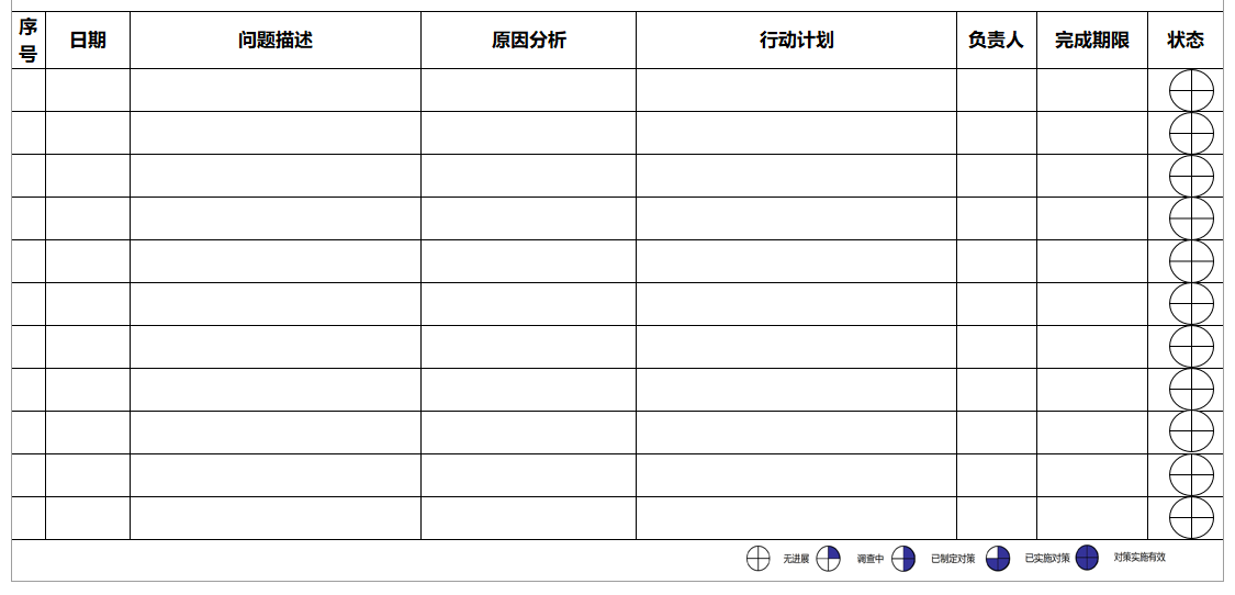 行动计划表说明班组中存在的问题点,班组长需要在现场对发生的问题进行及时准确的描述,然后用5why查找发生问题的根本原因,对根本原因分析后展开行动去解决问题。在这张表单中,需要注意的是每个行动计划的状态要清晰明了,让所有管理人员都要了解到。