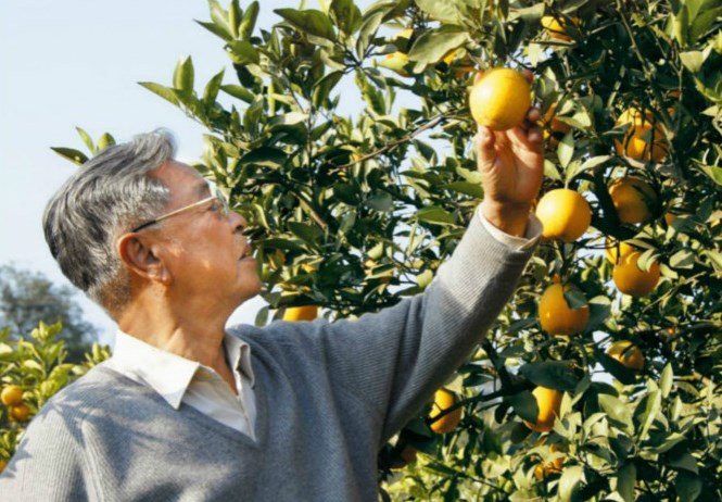 褚时健先生在察看果情,他于1928年生于云南省玉溪市华宁县禄丰乡矣则村。
