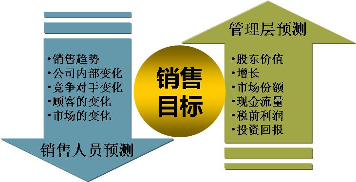 所谓自上而下就是指企业最高领导人根据股东价值、营业额增长、市场份额、现金流量、税前利润、投资回报等确定销售目标,其中,目标一般还分为理想目标、力争目标和必保目标。理想目标就是董事会最好的预期或者公司需要上市的要求;力争目标则是指整体市场平均的增长率或标杆企业的增长率,如果这个目标没有达到,公司的市场份额其实在不断地缩小;必保目标则是保证公司运营所能容忍的最低目标,低于这个目标,企业会有大麻烦,但一般公司最高层不会把这个目标公布出来。