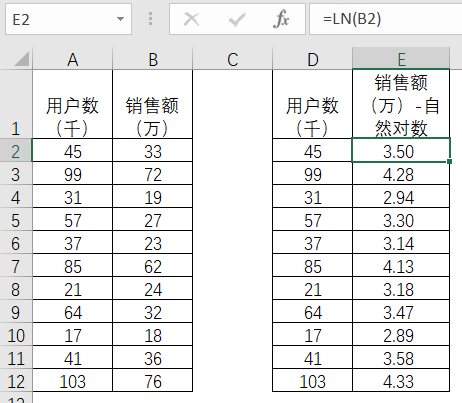 本例对销售额使用Excel函数ln进行自然对数变换,结果保留两位小数点。