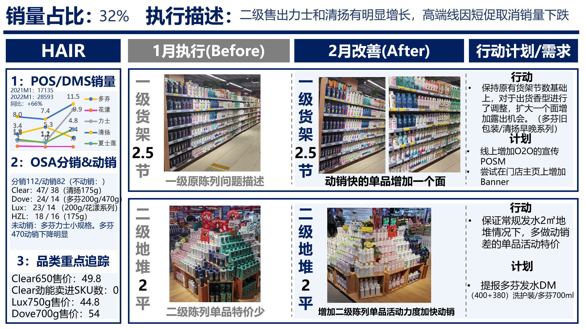 最后,第三张幻灯片来自对“洗衣护衣”品类的追踪分析,一方面通过2月份的新品上架带来了整体主货架多了5个陈列面位;另一方面在二级陈列上增设了醒目的促销台卡,尽管这个品类对于上个月的POS售出数据有小幅下滑,但是执行的优化和进步会让当地销售团队对后续的生意发展充满信心,坚持做正确的事情一定会有正向的生意回报。